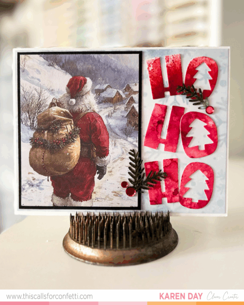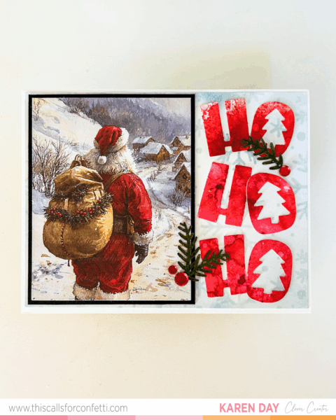 This card feels like a big holiday hug. Cozy, classic, a little cheeky—and full of all my favorite things to play with this season. After finishing my last Santa card, I couldn’t resist diving into the same ephemera pack from This Calls for Confetti again. There’s just something about the artwork and warmth in these illustrations that gives your cards instant storybook charm. And this time, I paired it with something bold and playful—the HO HO HO Layering Stencil and Die Set.