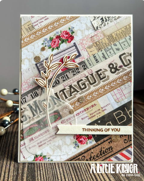 For the sentiment, I kept it simple: “Thinking of You,” stamped on a narrow banner. I love how the rich, vintage textures of the background contrast with the delicate linework of the honeysuckle sprig. And of course, I had to finish it off with a few glittery gold dots for a little sparkle and movement.