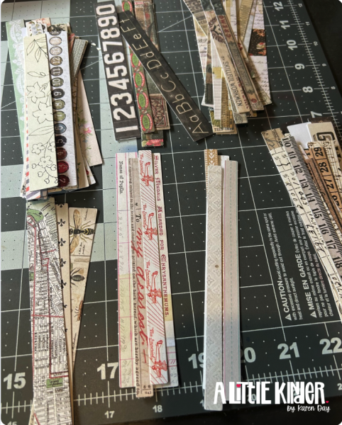 Every month on the 20th, I look forward to the Pattern Paper Instagram Hop—it’s the perfect excuse to dig into my stash and put all those beautiful but often neglected patterned papers to good use. This month, I reached for something that’s been sitting in my drawer just waiting for the right moment: the Tim Holtz paper strip pack. These paper strips are full of vintage charm, and their long, narrow shape gave me the perfect foundation for a background I’ve been wanting to try.